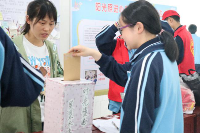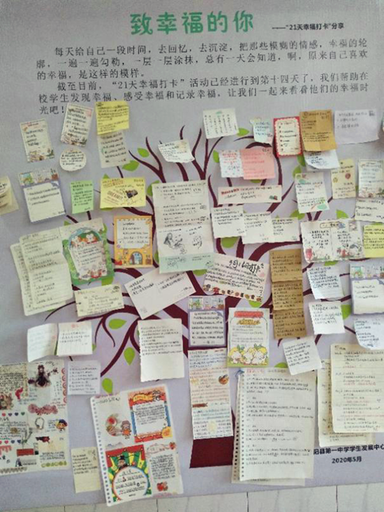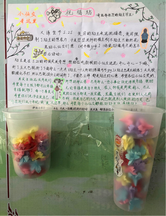02:学生祝福帖 活动期间,有高二学生自主发起了折花送祝福活动。 学生的自发行为,更让我们几位老师觉得我们这次的阳光心理月活动进行得成功、有效果。尤其是学生的活动还非常贴合我们本月的幸福主题。