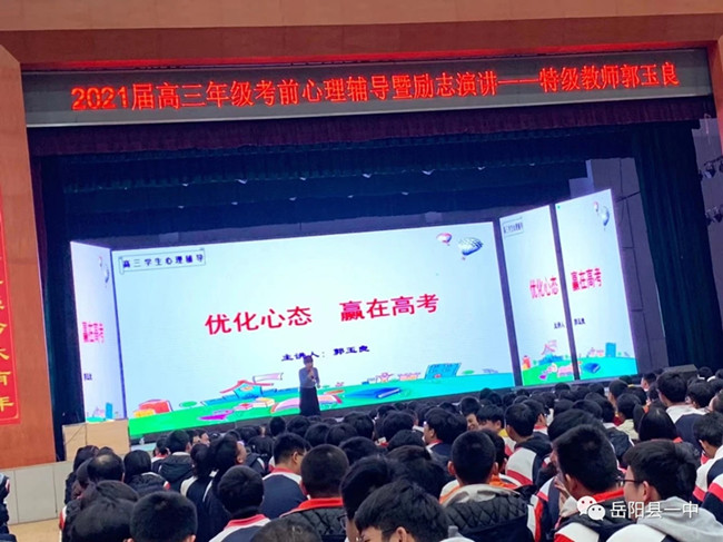 高三学生临近考试,学习压力越来越大,心情越来越焦虑。失眠,无法专心,厌学...为使同学们更好调适心理,缓解考试焦虑,正确看待考试成绩,以自信、乐观、健康向上的心态备战高考,虽然高考复习备考紧张、忙碌,我校还是以学生全面健康发展为目标,邀请全国模范教师、全国优秀班主任、正高级教师郭玉良老师,于3月14日在学校体育馆举行高三学生心理专题辅导讲座。