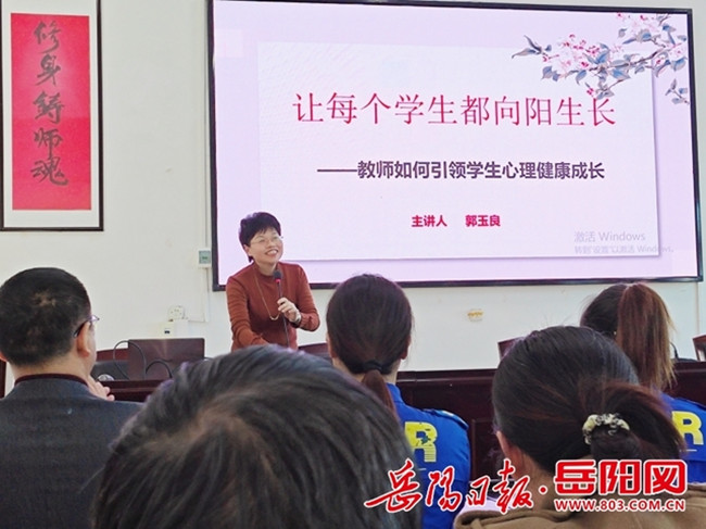 岳阳日报全媒体讯(通讯员 严竟菲)3月11日,华容县状元湖实验学校会议室座无虚席,全国模范教师、全国优秀班主任、全国巾帼建功标兵、心理健康教育正高级教师、特级教师郭玉良老师以“让每个学生都向阳生长”为主题,给学校全体教职工进行了一次有意义的心理健康教育专题培训。